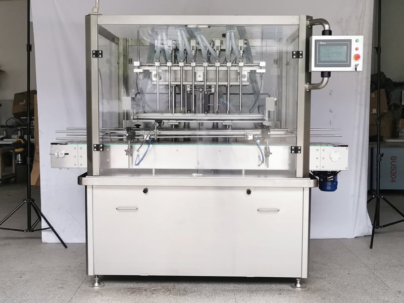 Using twelve synchronized gear pumps, this liquid filling machine achieves accurate and high-speed filling for 0.5–5L lubricant bottles. It can be fitted with an optional storage tank and features a touchscreen interface, PLC control, servo-driven operation, and automatic CIP cleaning. The entire filling machine is made of stainless steel (SUS304) for durability and hygiene.