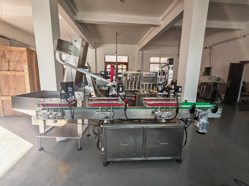 The servo capping machine features a robotic arm for cap placement and tightening, accommodating large height differences among bottles from 0.5L to 5L. It uses a fixed cap-picking position and adjustable guide rails to ensure quick changeovers and compatibility with various cap sizes. Two capping units are installed to match the line’s total production capacity.
