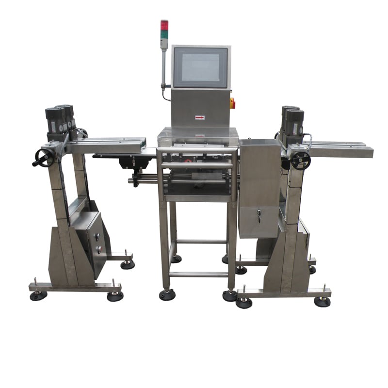 The checkweigher automatically verifies bottle weight and rejects any that fall outside the required standards. Bottle-clamping conveyors on both sides keep each container stable without tipping during transfer.