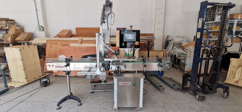 This servo-driven four-wheel capping machine automatically tightens caps using four rotating wheels, ensuring stable torque and uniform sealing. The servo motor allows precise torque adjustment to accommodate different bottle and cap types.